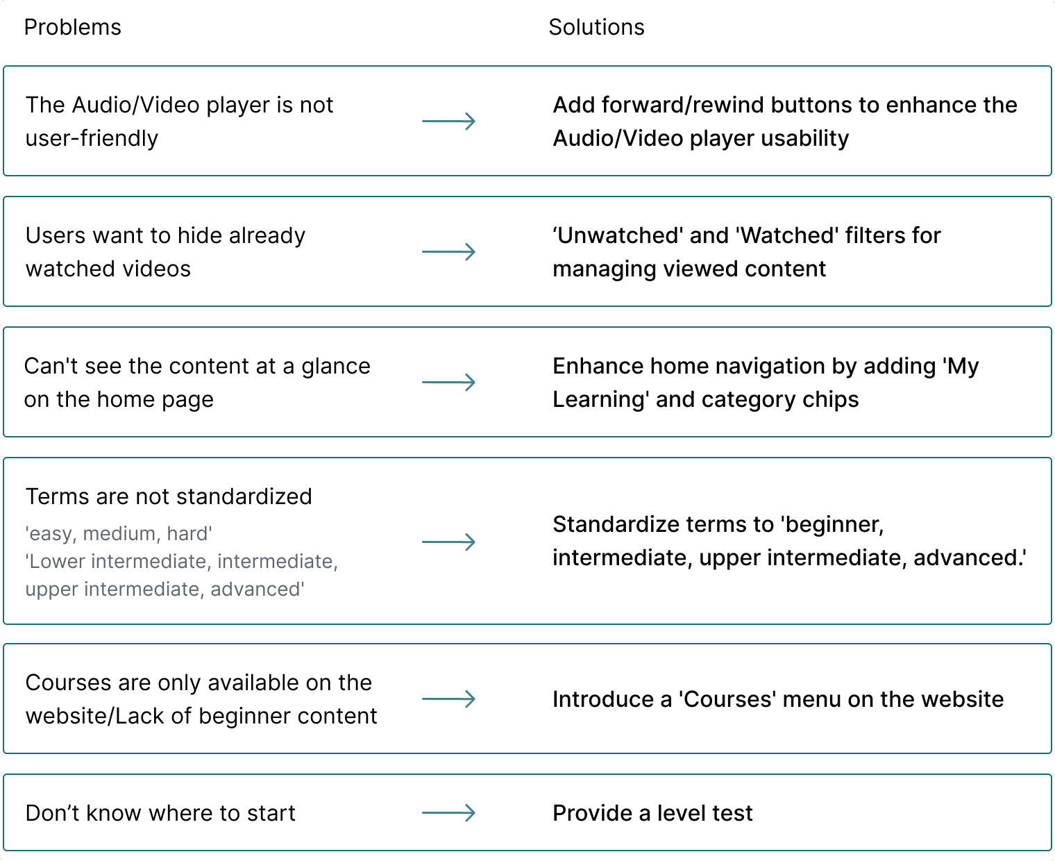 Through the Emphasize and Define stages, I identified several issues and proposed the following solutions for each problem.