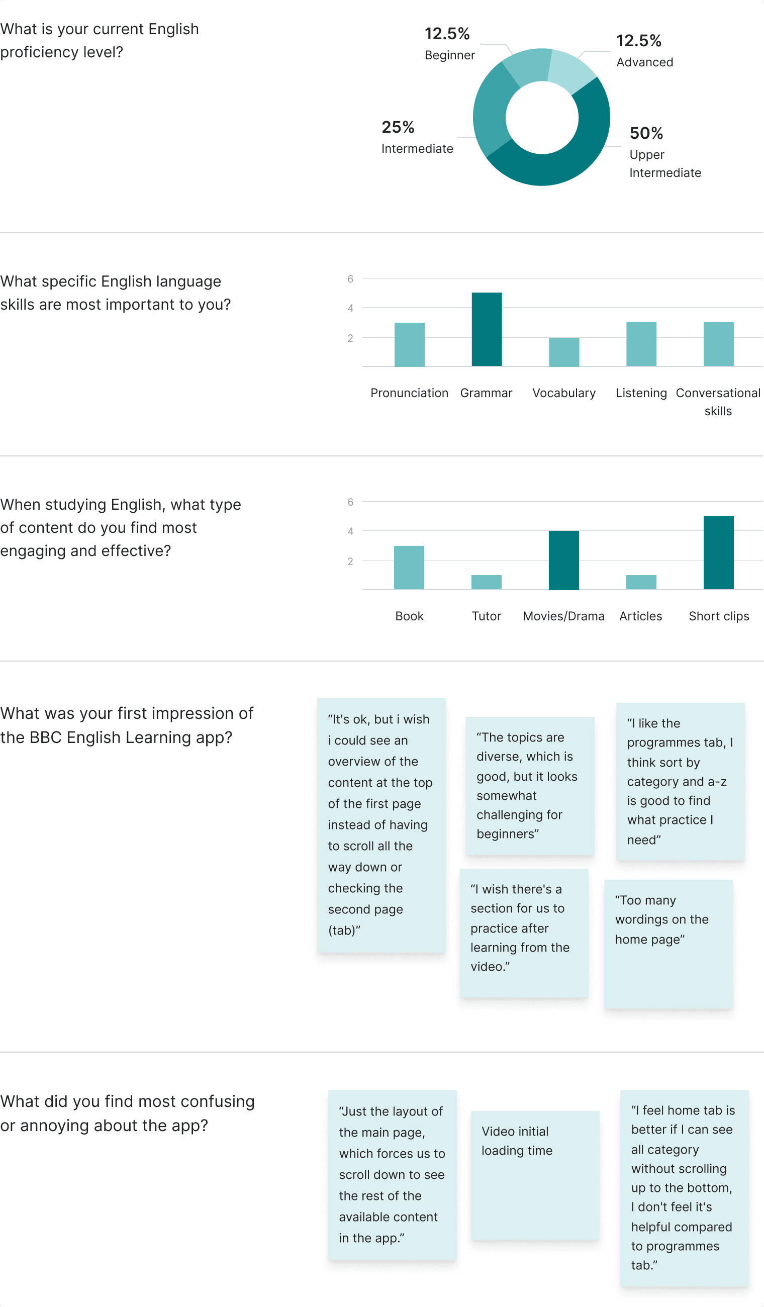 In the next step, I conducted a brief survey with 8 individuals currently studying English and who had never used BBC English Learning app before, analysing their feedback on the app.