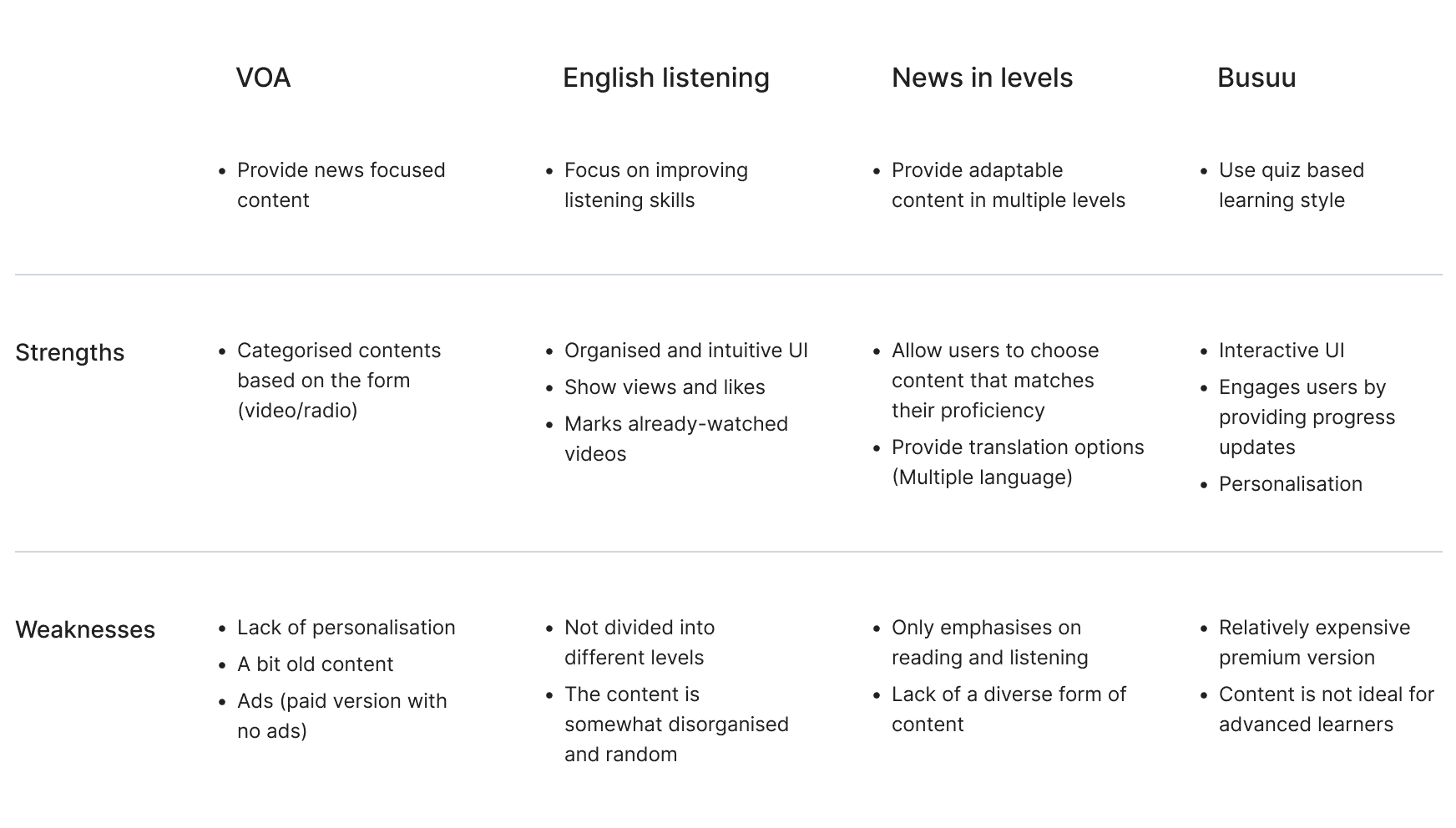 I conducted a competitive analysis of BBC Learning English's app, comparing it with VOA, English Listening, News in Levels, and Busuu.