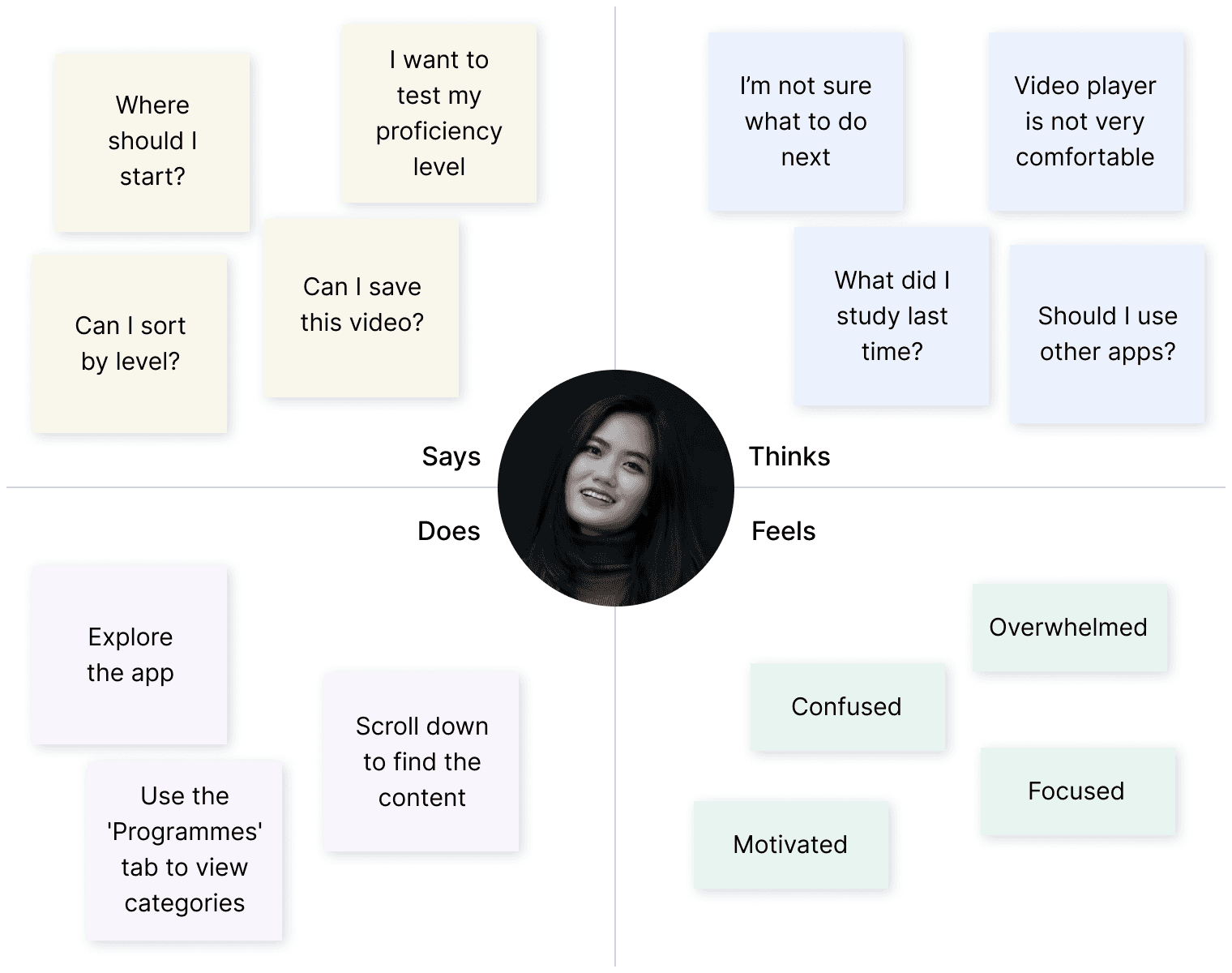 Then, I created an empathy map focused on users' behavior when using the app to gain a deeper understanding of their experiences.